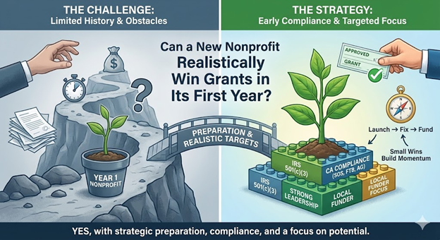 New nonprofits can realistically win grants in their first year if they complete federal 501(c)(3) recognition early in that year, maintain current compliance with California’s three-agency requirements (Secretary of State, Franchise Tax Board, Attorney General Registry), target funders who specifically support emerging organizations or capacity building, demonstrate strong leadership and governance despite limited operational history, and pursue modest initial awards from local or regional sources rather than attempting large national grants requiring extensive track records. Eligibility varies by grant, but first-year success depends more on targeting appropriate funders who value organizational potential and community need over established performance history, while maintaining the compliance profile and documentation organization that allows credible applications despite newness.