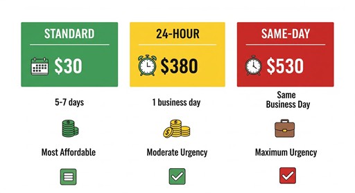 Cost-benefit reality: Same-day filing adds $500 to save approximately 5-7 calendar days on California processing. Ask: Does your specific situation justify this investment?