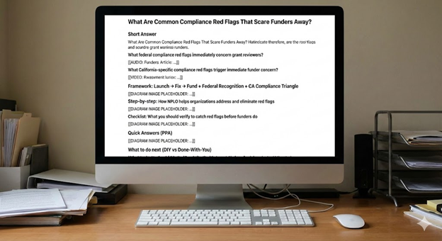 If we discover red flags during grant application preparation, should we still submit or wait until problems are fixed? Generally, wait until major red flags are corrected before submitting applications. Submitting applications with known IRS revocation, FTB suspension, or other serious compliance problems wastes time and often creates negative impressions with funders who may remember the problematic application when you reapply later with restored compliance. Minor red flags—slightly outdated documentation or small governance gaps—might be acceptable to explain if application deadlines are imminent and the program opportunity is time-sensitive. But major compliance failures should be fixed before applying. Contact funders directly to ask whether addressing red flags before submission or submitting with explanation of remediation in progress serves applications better.