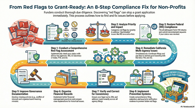 Step 2: Priority and Impact Analysis We categorize identified red flags by severity and urgency—which problems block all funding immediately (like IRS revocation or FTB suspension) versus which create concerns but don’t absolutely prevent applications (like slightly outdated board rosters or minor governance documentation gaps). This prioritization guides remediation strategy, ensuring you address dealbreaker problems before investing time in lower-priority improvements.