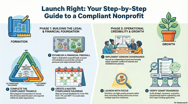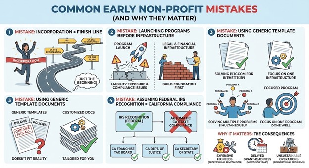 Common early mistakes include treating incorporation as the finish line when it’s just the beginning of a multi-step compliance process requiring IRS determination and California registrations, launching programs before establishing legal and financial infrastructure creating liability exposure and compliance problems, using generic template documents without customization leading to bylaws and policies that don’t fit organizational reality, assuming federal IRS recognition automatically provides California state compliance when three separate California agencies require independent filings, and starting with overly ambitious scopes trying to solve multiple problems simultaneously rather than focusing on one program done well. These mistakes matter because they create expensive Fix needs requiring professional remediation, delay grant-readiness by months or years while compliance is established, and sometimes result in organizations never achieving sustainable operations because foundational problems weren’t addressed during Launch.
