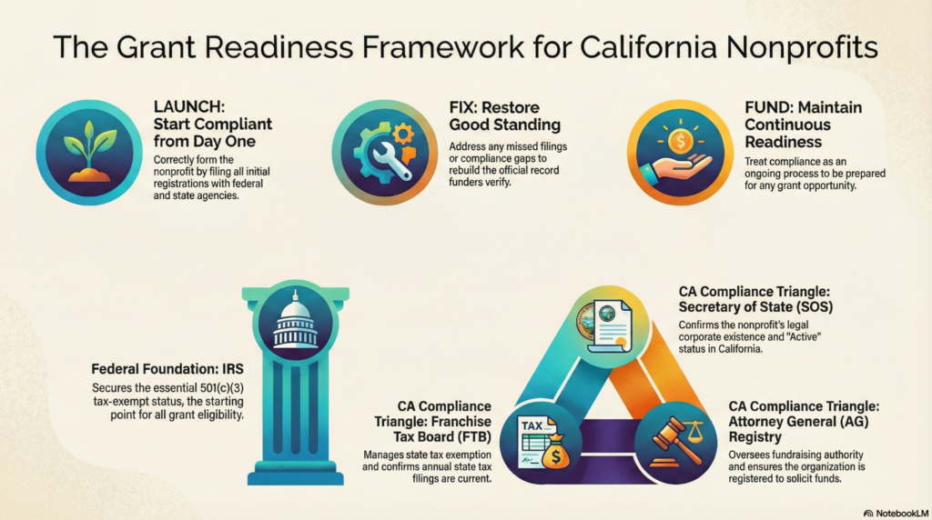 This multi-agency reality often surprises first-time grant applicants in Temecula and throughout the Inland Empire. Many assume that having an IRS determination letter and being “Active” with the California Secretary of State is sufficient. However, institutional funders—foundations, county grant programs, and federal pass-through awards—typically require documentation proving current compliance across all relevant agencies before they’ll release funds.