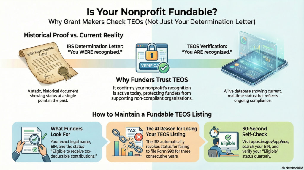 TEOS updates regularly as the IRS processes new exemption applications and revokes recognition from organizations that fail to meet annual filing requirements. If a nonprofit appears in TEOS with “Eligible to receive tax-deductible contributions” status, it confirms current federal recognition. If an organization doesn’t appear in TEOS or shows revoked status, it signals serious compliance problems that will block most funding opportunities.