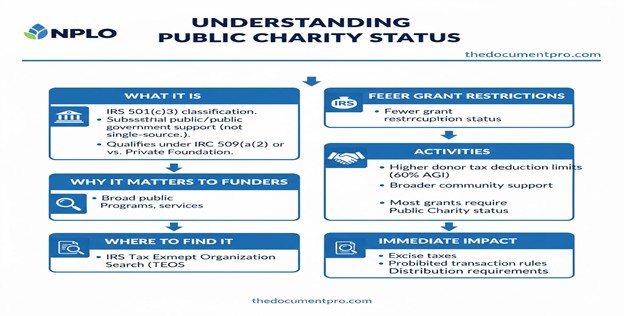 Public charity status is an IRS classification within 501(c)(3) designating organizations that receive substantial support from the general public or government rather than from a single source, qualifying under Section 509(a)(1), 509(a)(2), or 509(a)(3) rather than being classified as private foundations. Funders care because public charities face fewer restrictions on activities and grant-making, donors receive higher tax deduction limits for contributions to public charities versus private foundations, public charities demonstrate broader community support and engagement rather than single-source control, and most foundation and corporate grant programs explicitly restrict funding to public charities excluding private foundations from eligibility. The classification appears in IRS determination letters and matters immediately—organizations classified as private foundations face additional excise taxes, prohibited transaction rules, and mandatory distribution requirements that public charities avoid.