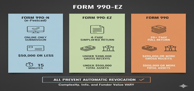 Form 990-N (e-Postcard) is a simple online-only submission for organizations with gross receipts normally $50,000 or less requiring only basic identifying information and taking 15 minutes to complete, Form 990-EZ is a 4-page simplified return for organizations with gross receipts under $200,000 AND total assets under $500,000 providing moderate financial detail with fewer schedules, and Form 990 is the comprehensive full return required for organizations with gross receipts of $200,000 or more OR total assets of $500,000 or more spanning 20+ pages with extensive financial reporting and multiple required schedules. All three satisfy annual filing requirements and prevent automatic revocation, but they differ dramatically in complexity, information disclosed, and value to funders evaluating organizational capacity—sophisticated funders prefer fuller returns showing financial health and governance practices that the e-Postcard doesn’t provide.